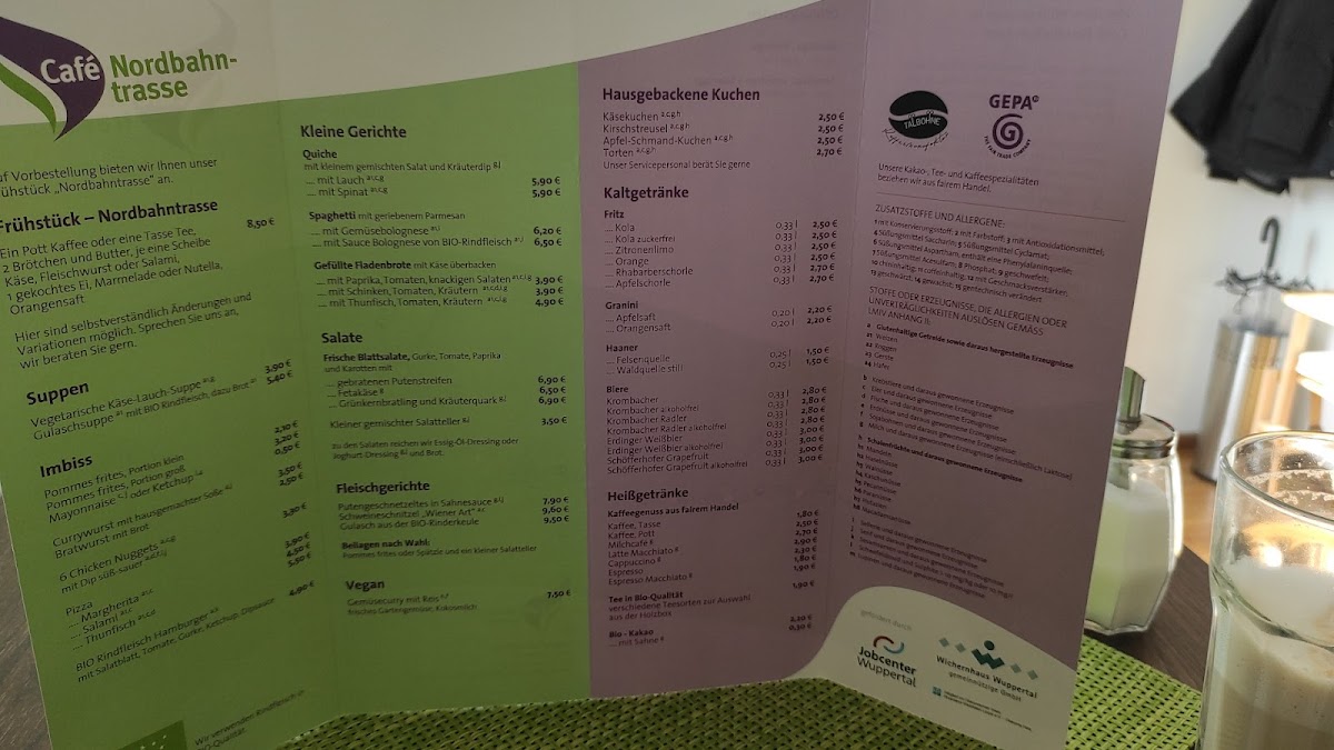 Introducing the menu at Cafe Nordbahntrasse, a delightful café nestled in the heart of Wuppertal, where good taste meets affordability. This charming spot, located at Langobardenstraße 65, offers an enticing selection of homemade cakes and hearty dishes, crafted with quality ingredients including Gepa© products.